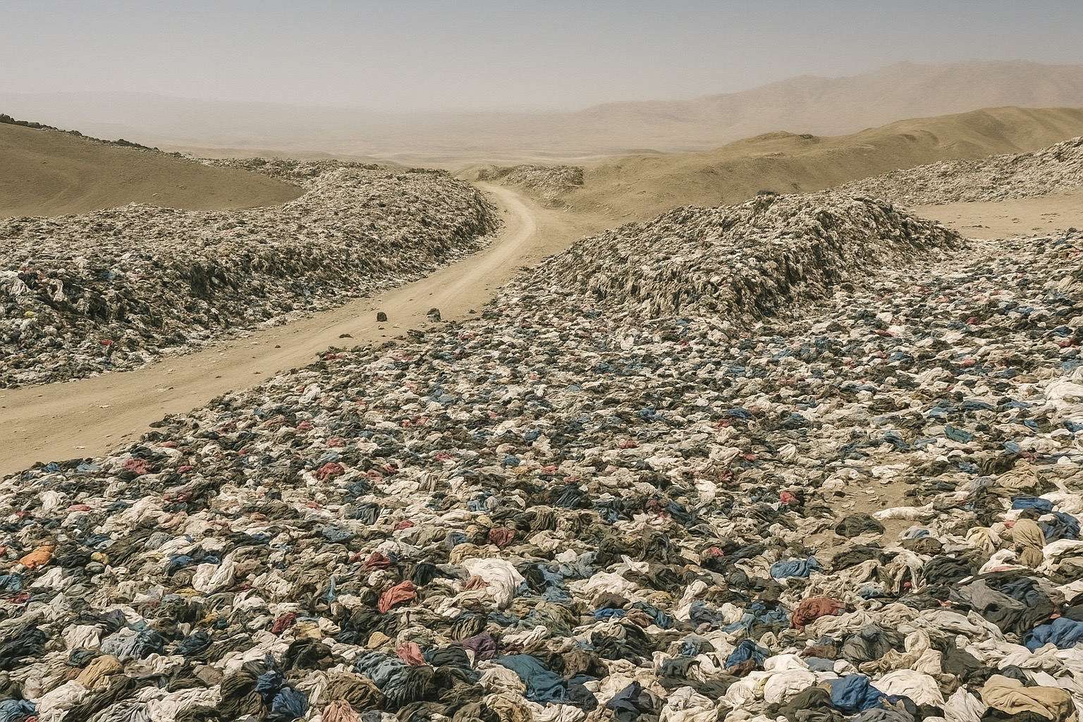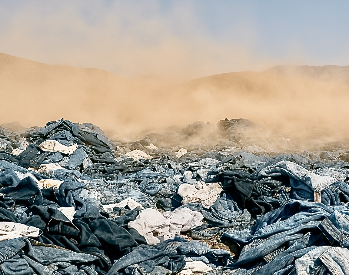 世界では毎年約9,100万トン(約3,000億着)の衣服が廃棄されており、その多くが後進国へ送られ、焼却もされずに“衣服の墓場”として放置されています。